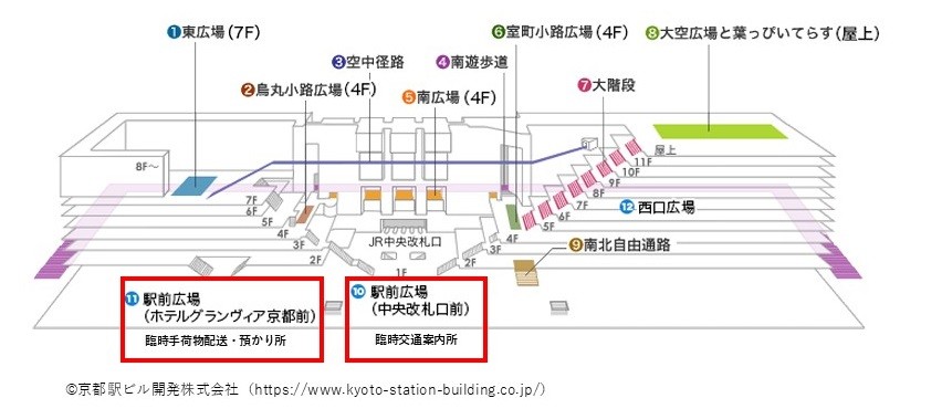 京都駅(駅前広場(ホテルグランヴィア京都前))において、臨時手荷物配送・預かり所を開設し、手荷物の一時預かりを行います。