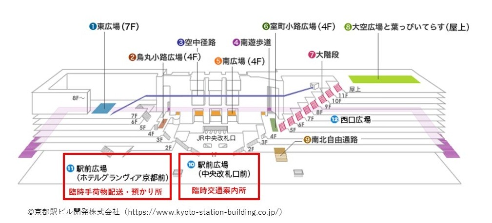 A temporary luggage delivery and storage counter will be set up at Kyoto Station (Station Plaza in front of Hotel Granvia Kyoto) to provide short-term luggage storage services.Advance reservations for luggage services such as “ecbo cloak” (operated by ecbo Inc.) are also available.